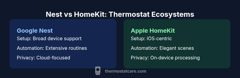 Google Nest and Apple HomeKit each offer strong thermostat experiences, but they cater to different ecosystems: Nest thrives with broad compatibility and Google Assistant, while HomeKit emphasizes iOS integration and privacy. For cross‑ecosystem control, consider Matter-enabled devices or bridges. Thermostat Care's verdict suggests choosing the path that aligns with your daily routines and data preferences.