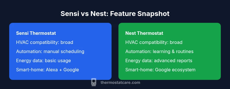 According to Thermostat Care, when weighing sensi thermostat vs nest, homeowners often trade simplicity for smart automation. Thermostat Care analysis shows Nest tends to offer advanced learning features and stronger integration with Google Home, while Sensi emphasizes broad compatibility and straightforward setup. The quick takeaway: choose Nest if you want automated comfort and robust energy insights; choose Sensi if you prioritize easy installation, broad compatibility, and predictable performance.