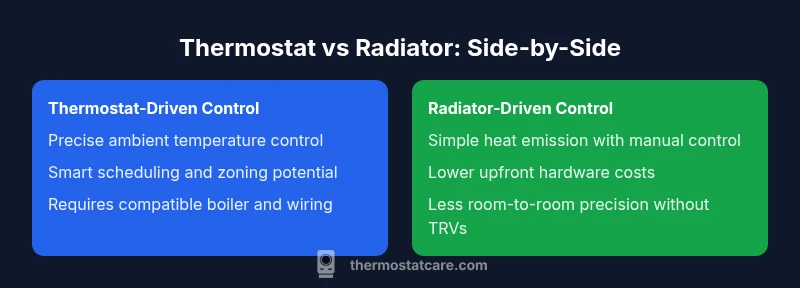 According to Thermostat Care, the thermostat acts as the brain of a heating system. It senses room temperature, compares it to a setpoint, and signals the boiler or heat source to turn on or off. The radiator, by contrast, is the heat emitter that transfers heat into the room. In a traditional setup without advanced controls, radiators may produce heat on a fixed schedule or at fixed power, which can lead to overshoot, cold spots, or wasted energy. The thermostat, when properly installed, creates a feedback loop that keeps comfort steady while avoiding unnecessary cycling of a boiler or heat pump. For homeowners considering a thermostat vs radiator decision, the distinction is not just about components, but about how those components work together to manage load, room temperature, and occupant comfort. The Thermostat Care team emphasizes that control strategy matters as much as hardware quality when aiming for efficient warmth.