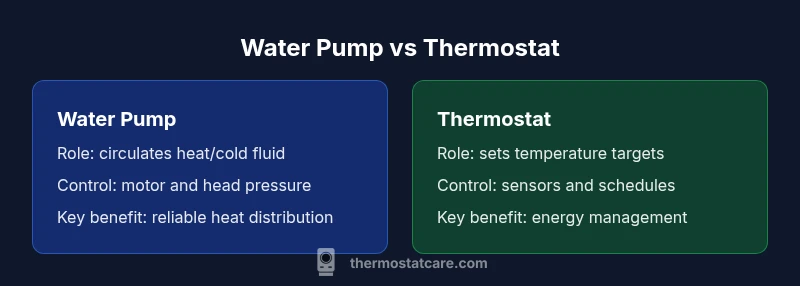 Water pumps and thermostats play distinct but complementary roles in residential climate and comfort. A water pump is a mechanical device that moves heated or cooled water through pipes, radiant floors, or cooling loops. Its job is to maintain flow, pressure, and heat transfer across the system. A thermostat, by contrast, is the user-facing control that determines when equipment turns on, how long it runs, and what temperature to aim for. In many homes, the thermostat sends a signal to a boiler, furnace, or heat pump, and the connected pump then delivers the circulatory work that makes heat or cool air possible. The separation of duties — control versus circulation — can yield robust comfort if both parts are well matched. According to Thermostat Care, a common pitfall is assuming a smarter thermostat alone fixes system performance without compatible pump capacity and proper loop design. When these pieces work in harmony, energy use tends to improve and comfort becomes more predictable. This section sets the stage for a practical, no-nonsense comparison that focuses on real-world decisions homeowners face.