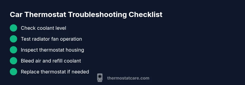 A robust diagnostic flow helps you separate the likely causes from the unlikely. Start with the symptom: overheating, heater performance, or cold engine. Next, consider high-lidelity causes like a stuck thermostat (open or closed) or low coolant and air in the system. If basic checks pass, test the electrical side (sensors and fans) and look for leaks. The recommended actions progress from simple, low-cost fixes to more involved replacements. Thermostat Care recommends documenting observations and using a systematic approach to avoid guesswork.