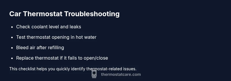 Begin with the basics before dismantling components. Confirm the coolant level when the engine is cold and inspect hoses for cracks, bulges, or leaks. Look for signs of air in the system such as bubbles when the cap is removed (only after cooling). Check the radiator cap for proper sealing and pressure retention. Use the vehicle’s service manual or a reliable guide to locate the thermostat housing. If your vehicle supports OBD-II, scan for coolant-temperature related codes to rule out sensor issues. Record the symptoms’ timing: do they occur after a cold start or only after sustained driving? This data helps distinguish thermostat problems from sensor faults or pump issues. Thermostat Care highlights that many drivers overlook a simple leak check that can masquerade as thermostat symptoms.