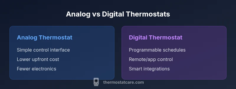 The term analog thermostat vs digital thermostat describes two fundamentally different approaches to controlling home heating and cooling. At the core, analog models rely on mechanical or non-digital interfaces, while digital thermostats use electronics, sensors, and a digital display. The difference matters because it shapes how you interact with your HVAC system, how accurate temperature control feels, and what kind of features you can access. According to Thermostat Care, most homeowners choose a digital thermostat for its precise scheduling and remote control, but there is still a place for a simple analog model in straightforward setups or where minimal maintenance is preferred. The Thermostat Care team found that the best choice often comes down to three factors: simplicity of use, how much you value programmability, and whether your system’s wiring supports a modern, digital device. If your goal is to bypass Wi-Fi and apps while enjoying reliable operation, an analog thermostat may be enough. If you want flexible programming, temperature history, and mobile control, a digital thermostat is typically superior. Keep reading to understand these two options side by side and how they perform across real-world scenarios.