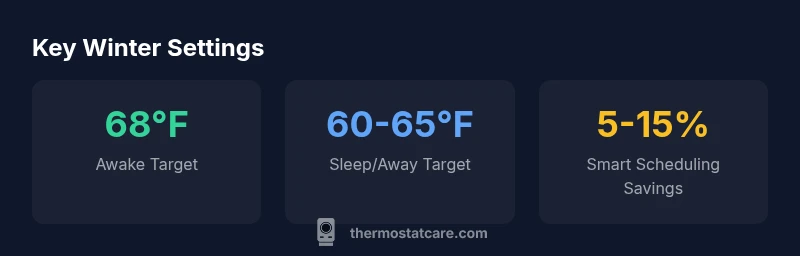 According to Thermostat Care, the way you set your thermostat in winter affects both comfort and energy bills. Understanding the relationship between indoor temperature, outdoor conditions, and home insulation helps answer the common question what to keep thermostat at in winter. A typical starting point is to set the thermostat around 68°F (20°C) when people are home and active. Lowering the temperature by a few degrees during the night or when you're away reduces heat loss without compromising wake-time comfort. If you have a programmable or smart thermostat, you can automate these changes so the house isn't warm while you're out or asleep, but is ready when you return. Thermostat Care analysis, 2026 shows that modest setbacks—about 6-8 hours per day—often pay for themselves within the heating season while preserving comfort.