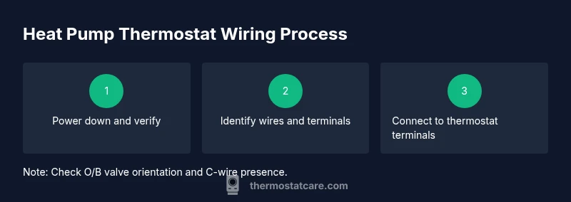 A heat pump thermostat wiring diagram is a map of how the thermostat connects to the indoor air handler and outdoor unit. It shows the terminal labels on the thermostat base (R, C, Y, G, O/B, Aux/E, W1) and the corresponding control wires from the heat pump system. Knowing how to read this diagram helps you wire or troubleshoot without guessing, reducing the risk of damage to equipment or voiding warranties. According to Thermostat Care, the wiring diagram is the single best tool for ensuring your heat pump operates reliably in heating and cooling modes, especially in climates where reversing valve operation matters most. Start by locating the system’s control board and the thermostat connection block, then compare the wire colors and functions to the diagram. If you find discrepancies between colors and terminal labels, rely on the diagram rather than wire color alone. When in doubt, pause and re-check before connecting to a live circuit.