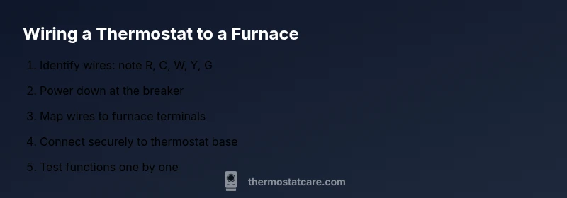 You will learn how to wire a furnace thermostat using a standard five-wire setup, identify common terminals (R, C, W, Y, G), and verify connections safely. This guide covers when to use a C-wire, how to map terminals on both thermostat and furnace, and essential safety steps. Tools like a screwdriver, multimeter, and wire strippers are required. Safety first: shut off power before starting.