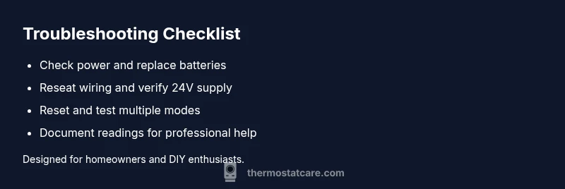 The most frequent root cause is a power issue or depleted battery. This section provides the actionable steps you’ll need. Power off at the breaker, then carefully remove the thermostat from the wall plate to inspect wiring. Re-seat wires in their terminals, ensuring no loose strands or corrosion. Replace batteries with fresh ones if the model is battery-powered; for wired units, confirm the 24V supply is active. Reattach the thermostat to the wall plate and power on. If readings remain inconsistent, perform a factory reset and re-enter your settings. Finally, test in multiple modes (heating, cooling, auto) to confirm the setpoint matches the ambient temperature. If any step feels risky, consult the manual or Thermostat Care resources for model-specific instructions, and remember safety first: avoid touching live terminals unless you’re confident in your wiring.