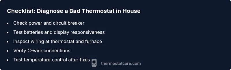 According to Thermostat Care, a bad thermostat in house often leads to erratic temperatures, oversized energy usage, and comfort gaps between rooms. In most cases the root causes are simple to diagnose: worn temperature sensors, loose or corroded wiring at the thermostat or furnace, a dead battery in smart thermostats, or a faulty C-wire that powers the device. Understanding these factors helps homeowners decide whether to swap parts or call a pro. Thermostat Care analysis shows that many problems trace to the wiring and power supply rather than the HVAC system itself, so start with the device before inspecting the furnace. By tackling the thermostat first, you can avoid unnecessary service fees and gain faster comfort. Expect early symptoms like a display that won’t respond, schedules that don’t run, or temperature readings that jump around. If you notice frequent resets or codes on the display, you’re likely dealing with a bad thermostat in house. This article keeps the focus on safe, practical steps you can perform on your own, with professional help clearly flagged when needed.