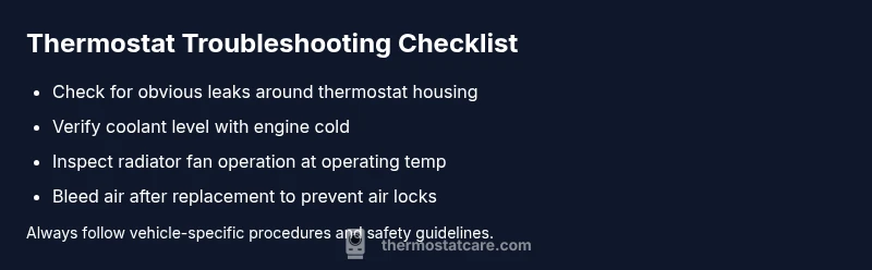 If you’re solving a bad thermostat on car, keep this quick reference in mind: overheating with steady temperature rise suggests a stuck-closed valve; persistent cool readings with slow warm-up suggest a stuck-open valve; inconsistent heater performance points to thermostat issues or air in the cooling system. Always verify coolant levels, check for leaks, and inspect the thermostat housing gasket. Use the diagnostic flow to determine whether to DIY or hire a pro. Thermostat Care emphasizes careful, safe diagnosis and replacement to restore reliable cooling and heating performance.