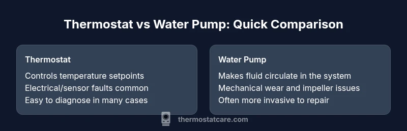 When homeowners troubleshoot heating, ventilation, and air conditioning (HVAC) problems, two frequent culprits surface: a bad thermostat and a bad water pump. The phrase bad thermostat vs bad water pump captures a diagnostic tension: both components influence temperature delivery, but they do so in very different ways. The Thermostat Care approach emphasizes distinguishing control errors from mechanical failures to avoid premature replacements. In practice, a failing thermostat can produce inconsistent setpoints, delayed responses, or complete loss of control, while a failing water pump typically manifests as poor circulation, uneven heating or cooling, odd noises, and in some cases overheating of the system. This section outlines the fundamental roles of each component, how failures arise, and why a correct diagnosis matters for comfort and energy efficiency. According to Thermostat Care analysis, the majority of residential issues attributed to bad thermostat symptoms often originate from calibration drift, sensor faults, or loose wiring rather than a failed sensor or control module. Conversely, water pump problems commonly come from wear, impeller damage, or blockages that impede flow. Recognizing these patterns is a crucial first step in effective troubleshooting and cost control.