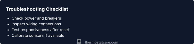 Thermostat problems follow a logical path: identify the symptom, consider the most likely causes, test each hypothesis, and apply the corresponding fix. If the symptom is a nonresponsive display, the cause is often power or a failed component; if the setpoint won’t move, the issue could be a stuck control or a software lock. By following a structured diagnostic flow, you can prioritize safe, simple remedies before moving to more involved tasks. Thermostat Care analyses consistently show that orderly checks reduce unnecessary service calls and improve reliability in 2026.