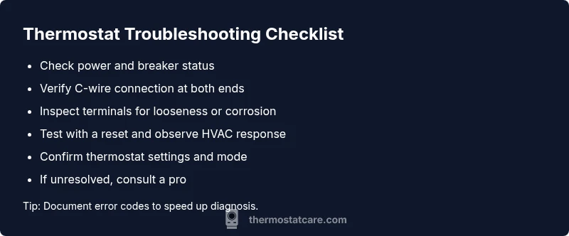 A symptom-led approach helps you stay systematic. Start with a clear description of what’s happening (e.g., “no response to adjustments,” “temperature drift,” or “display blinking”). Then verify power and the C-wire, confirm correct system settings, and check that the HVAC equipment responds when you manually test it at the furnace/air handler. If the symptom persists after these checks, you’ve identified a likely fault path (power issue, wiring fault, control board problem) and can decide on the next best step. Thermostat Care recommends documenting each step you take and noting any environmental factors that could influence performance, such as temperature swings or electrical noise in the panel.