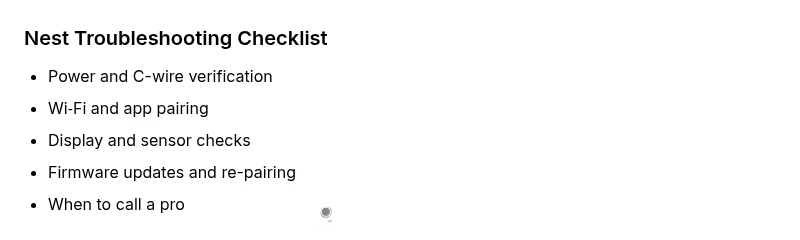 Nest thermostats can fail for a variety of reasons, but most issues fall into a few predictable categories: power supply, wiring stability, Wi‑Fi connectivity, and software or firmware glitches. When the thermostat won’t turn on, or the display is dim or unresponsive, start with the simplest checks before moving to more complex fixes. According to Thermostat Care, many common problems with nest thermostat begin with a marginal power supply or a loose wire. Recognizing the pattern helps homeowners triage quickly and safely, reducing the need for costly service calls. This section lays the groundwork by outlining typical failure modes and how they interact with your HVAC equipment. By identifying whether the symptom is power-related, connectivity-related, or software-related, you can prioritize steps that restore function without risking safety. Keeping a small diagnostic log—date, symptom, and the fix you tried—can speed future troubleshooting and prevent repeating steps. The Thermostat Care team emphasizes cautious, incremental testing so you stay in control of the resolution process.