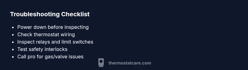 Thermostat Care’s analysis shows that most on/off failures are triggered by a stuck relay, a compromised limit switch, or wiring faults. These parts are accessible in many systems with basic tools, but diagnosing control-board faults or gas-valve issues requires caution and, often, professional service. This article is designed for homeowners and DIY enthusiasts who want a practical, safe path to resolving the symptom while knowing when to escalate to an expert.