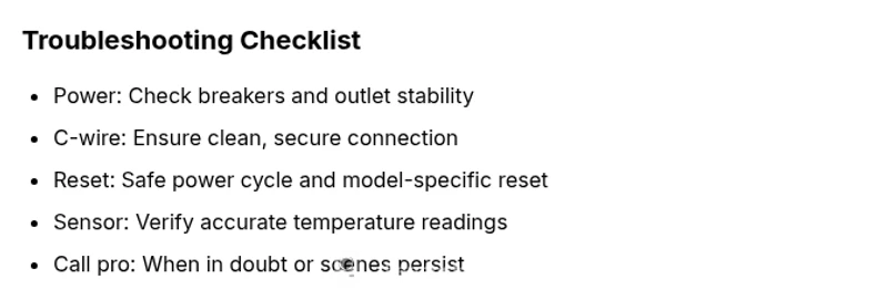 - Schedule periodic thermostat and HVAC system checks to catch wear and corrosion early. - Keep the thermostat current with firmware updates when available. - Use a surge protector or power conditioner for the thermostat power supply to reduce voltage spikes. - Replace older C-wires and ensure proper gauge and insulation. - Document changes to wiring or configuration so future service visits are faster and more accurate.