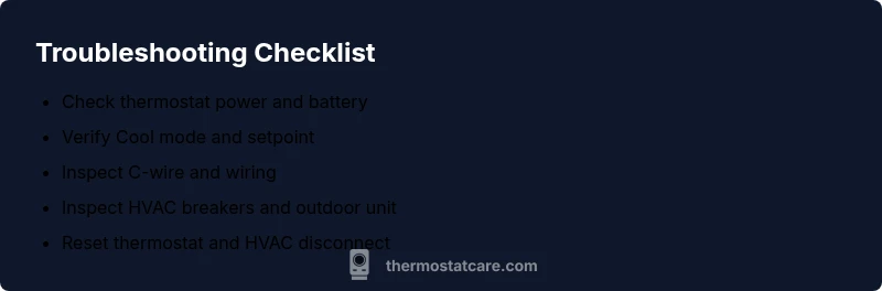 According to Thermostat Care, facing a non-cooling Honeywell thermostat is usually caused by simple, checkable issues that homeowners can resolve without an appointment. Before you call for service, gather two things: a clean set of eyes to inspect wiring and a plan to power-cycle the system. Start by confirming your model; check the display for any error codes, and note them for reference. Then verify that the thermostat is powered, the screen is bright, and that the battery (if applicable) isn’t dead. If you see a code, consult your manual or Thermostat Care’s guide to translate it into a fix. The key is to work in a logical sequence: power first, then settings, then connections, and finally the HVAC equipment. This approach minimizes risk and speeds up resolution.