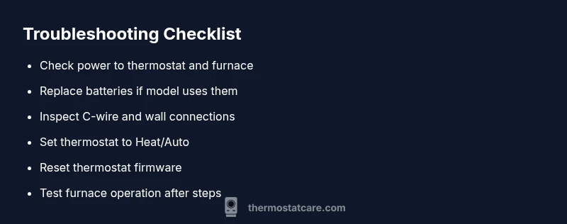 - Turn off power to the thermostat and furnace at the main breaker. 2) Verify the furnace switch is in the ON position. 3) Restore power and observe the thermostat display. 4) If the display returns, reset the thermostat to confirm normal operation. 5) If the screen remains blank, check or replace the C-wire and ensure all connections are clean and tight. 6) Reinsert or replace batteries if applicable. 7) Set the system to Heat or Auto and run a quick test call. 8) If the issue recurs, contact a licensed HVAC technician for a deeper inspection. [Tip: always ensure power is OFF before touching wiring.]