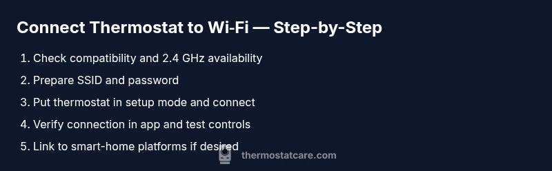 To connect your thermostat to Wi‑Fi, start with a compatible model and a 2.4 GHz network. According to Thermostat Care, a strong, stable connection ensures reliable scheduling and firmware updates. Have your Wi‑Fi name (SSID) and password handy, plus the thermostat’s mobile app installed. In the app, start the setup flow, select your network, enter the password, and confirm the connection. If your thermostat supports a temporary hotspot, connect to it first, then switch back to your home network.
