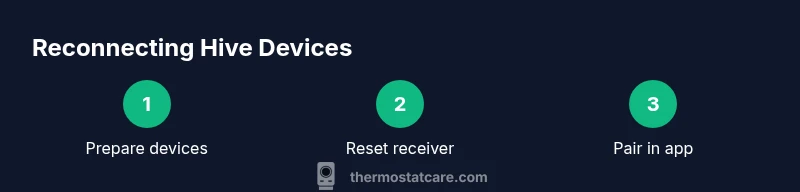 The Hive heating system relies on a thermostat communicating with a central receiver (hub) via a short-range wireless link, managed through the Hive app. When the link is broken, temperature data, schedules, and remote control may stop working. According to Thermostat Care, most reconnection efforts succeed when you approach the task calmly and methodically, using a clean pairing procedure. The goal is to re-establish a secure, two-way connection between the thermostat and receiver so your schedules and live readings stay accurate. In practice, you’ll typically place both devices into pairing mode and follow the app setup flow. This is a routine maintenance task that homeowners perform occasionally, and understanding the process reduces the chance of errors. By following these steps, you’ll reconnect quickly and with confidence, just like a pro. The Thermostat Care team emphasizes sticking to trusted steps and avoiding rushed, ad-hoc tweaks that can interrupt the pairing path.