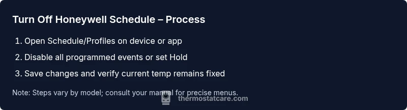 Turning off a Honeywell thermostat schedule replaces timed heating or cooling events with a fixed temperature, or allows you to use Hold mode until you decide to adjust again. This approach is common on both Wi‑Fi and non‑Wi‑Fi Honeywell models. According to Thermostat Care, editing the schedule is typically done through the thermostat display or the Honeywell Home app, depending on the model. You’ll preserve energy-saving opportunities only if you still use a fixed, energy-aware setpoint. If you normally rely on adaptive recovery or learning features, be aware these may be affected when the schedule is disabled. The goal of turning off the schedule is to simplify control and reduce unexpected temperature changes while you’re away or when family routines shift.