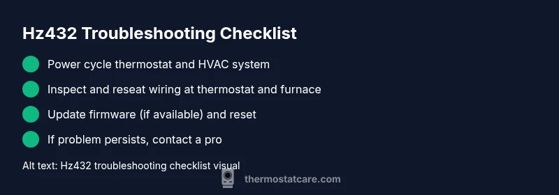 hz432 is a generic thermostat error indicating a fault in the communication between the thermostat and the HVAC control system. The most reliable quick fixes are a power reset, a check of wiring and battery status, and a firmware update or factory reset if available. If the error persists, consult the manual or your installer.