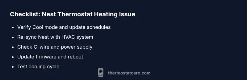 When your Nest thermostat is heating instead of cooling, it can feel urgent and confusing. The keyword nest thermostat heating instead of cooling captures the core problem homeowners face during shoulder seasons or when the thermostat misreads indoor temperatures. In many cases, the issue stems from a mode misconfiguration, a conflicting schedule, or a stale connection between the thermostat and the HVAC equipment. The Thermostat Care team notes that the most common triggers are mode selection errors in the Nest interface, incorrect zoning or sensor misplacement, and power interruptions affecting reliable sensor readings. Understanding how the Nest determines heating versus cooling helps you spot misconfigurations quickly and prevent unnecessary furnace runs. In practice, the fix is usually straightforward: verify mode, adjust scheduling, and re-sync devices. If the problem continues, it often means a deeper wiring or power issue that requires careful troubleshooting to avoid safety risks.