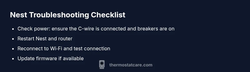 According to Thermostat Care, most Nest thermostat issues stem from power or connectivity problems, not mysterious hardware faults. In practice, the majority arise from a marginal 24V supply, a loose C-wire, an unstable wireless network, or an out-of-date firmware that causes the device to misread schedules or fail to update. Start by checking the basics: is the unit receiving constant power? Is the common wire connected securely at both ends? Is the router functioning normally with the Nest device authorized? By focusing on these root causes first, you can often restore stability quickly and avoid more invasive diagnostics. Many homeowners report that a simple power cycle, re-wiring a loose connection, or a router reboot resolves issues that seemed complex at first. The Thermostat Care team has seen this pattern repeatedly in 2026, reinforcing the idea that methodical checks beat guesswork.