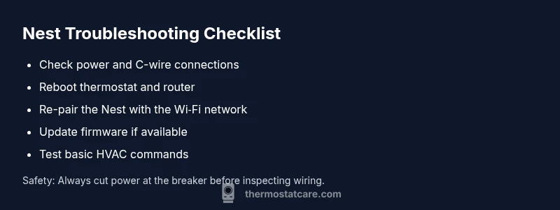 According to Thermostat Care, many Nest thermostat problems originate from simple, easily fixable causes like power loss, loose wiring, or a hiccup in the Wi‑Fi connection. Begin with the basics before diving into HVAC specifics. Check that the thermostat is physically powered (not blinking or dim), examine the C-wire connection at both the thermostat and furnace control board, and confirm the Nest app shows the thermostat as online. If you notice the display is dim or blank, a gentle reboot often clears temporary glitches. Keep your router nearby and ensure your phone or tablet can reach the network; a weak connection is a frequent culprit that leads to delayed or failed commands from the app.