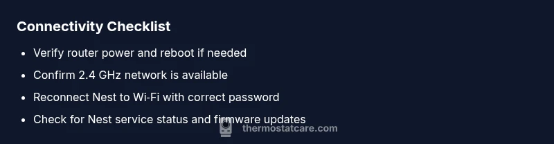When a Nest thermostat wifi disconnected, the root cause is almost always network or account issues rather than a hardware failure. The Thermostat Care team has analyzed typical interruptions and finds that Wi‑Fi signal strength, router settings, and Nest service status are the top culprits. In many homes, simply moving the router closer to the thermostat or rejoining the Wi‑Fi fixes the issue. Other times, a firmware update or a temporary Nest server outage can cause a momentary disconnect. Recognizing these patterns helps you act fast and avoid unnecessary resets. Throughout this guide, we’ll focus on practical steps you can take today to restore a reliable connection without guessing.