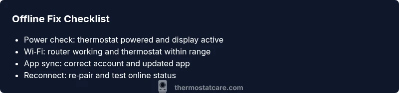 If your thermostat suddenly goes offline, perform these checks in order. First, check that the thermostat has power: verify the display is on and that the HVAC system is not in a power-saving mode. Then, confirm your Wi‑Fi is active on other devices. If your router recently rebooted or firmware updated, re‑establish the connection to the thermostat. Finally, verify your thermostat is linked to the correct account in the Resideo app. These quick checks catch the majority of outages in minutes.