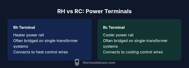 RH and RC are the two standard 24-volt power terminals found on many thermostats. RH powers the heating circuit, while RC powers the cooling circuit. The naming convention comes from older HVAC systems where heat and cool used separate transformers. In many modern homes, a single 24-volt transformer feeds both heating and cooling circuits, and RH and RC are tied together through a jumper. The Thermostat Care team notes that understanding these distinctions is essential for safe wiring and for ensuring your thermostat can control both heat and cool functions properly. If you’re replacing a thermostat, identify what kind of transformer your system uses before deciding whether to jumper RC and RH or wire them separately. This initial check prevents backfeed, misreading of temperature signals, and potential damage to the control board. When diagnosing issues, start by confirming which transformer powers heat, which powers cooling, and whether your thermostat supports dual transformer configurations. This rh vs rc thermostat distinction is particularly important for DIY wiring accuracy and safety.