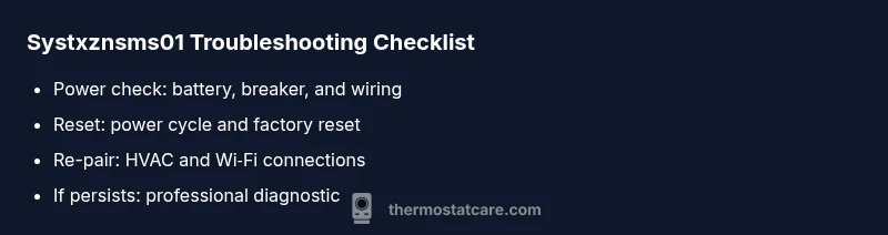 Regular maintenance and proactive checks can reduce the likelihood of systxznsms01 returning. Schedule periodic battery or power supply checks, ensure secure wiring connections at the thermostat, keep firmware up to date, and document changes whenever you replace components. A quick annual sanity check—verify that the thermostat can communicate with the HVAC and Wi‑Fi—helps catch issues before they escalate. Thermostat Care emphasizes that consistent maintenance is the best defense against repeat faults and unexpected outages.