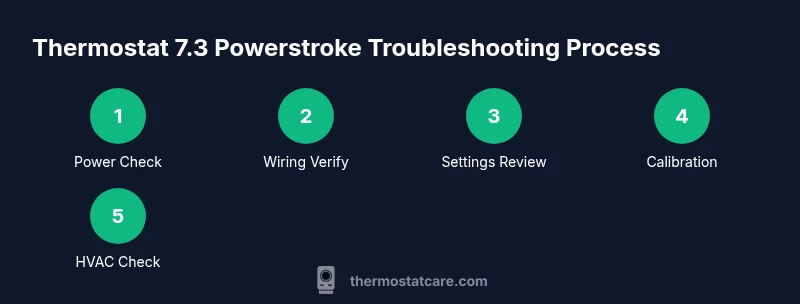 Approach the problem with a checklist mindset. For the thermostat 7.3 powerstroke, start by confirming power is reaching the thermostat and that the display is functioning. Next, visually inspect the wiring at the wall plate and the HVAC control board for loose or corroded terminals. If the thermostat is connected via a battery, verify the battery condition and replace if needed. Record any error codes shown on the display, as these signals point to specific root causes. If the unit communicates with a mobile app, ensure the app is current and that the device is connected to the same network. This section sets the stage for deeper diagnostics and reduces blind guessing. Thermostat Care’s practical observations indicate that most issues are addressable with basic power, wiring, and configuration checks.