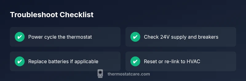 Step 1: Power cycle the thermostat by turning off the breaker for 60 seconds, then back on. Step 2: Check the thermostat circuit breaker and verify that the furnace or air handler is receiving 24V from the transformer. Step 3: If your model uses batteries, replace them with fresh ones and recheck the display. Step 4: If the screen remains blank, perform a reset according to the user manual, then re-link the thermostat to the HVAC system. Step 5: After reset, re-test heating and cooling to verify proper operation. Step 6: If your thermostat connects to WiFi or an app, reconnect and check for firmware updates. Tips: Keep a small note of your system configuration before resetting so you can restore settings quickly.