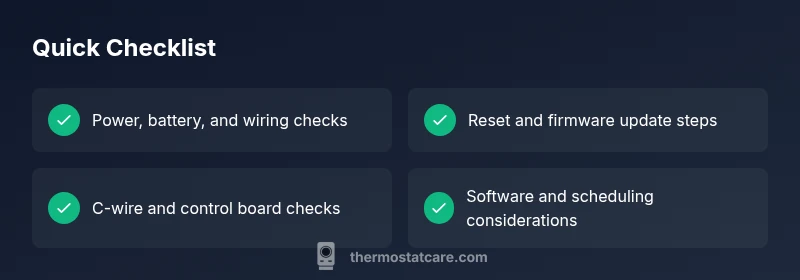 Smart thermostats rely on software to manage schedules and learning behavior. A misconfigured schedule can make the unit appear unresponsive or operate at odd times. Review your daily schedules, hold settings, and geofencing rules. If the thermostat is integrated with a home automation platform, verify that routines are not triggering conflicting commands. When software issues persist, check for firmware updates and re-sync with the HVAC system. Thermostat Care emphasizes keeping software up-to-date to prevent recurring glitches.