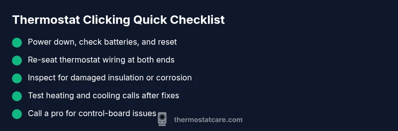 When a thermostat repeatedly clicks, it's usually signaling a relay switch or contact opening and closing in the control circuit. In many homes, this behavior happens as the device calls for heat or cooling to reach a setpoint, but the HVAC system can't respond smoothly. According to Thermostat Care Team, a ticking or clicking sound that's persistent is a red flag that should be addressed promptly, not ignored. The most common causes are mechanical relay chatter, loose or corroded wiring, or a dying battery in legacy models. For homeowners, the first step is to rule out simple, safe fixes and then narrow down the likely culprit. By understanding what the click indicates, you can decide whether you can safely troubleshoot at home or if you should bring in a professional. In short: a persistent click usually points to a mechanical or electrical connection issue rather than a mysterious software fault. This guide will walk you through practical checks, step-by-step fixes, and safety precautions you can use tonight.