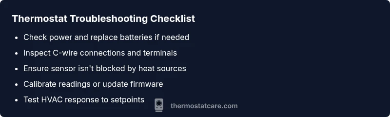 A systematic diagnostic flow helps you avoid wasted time. Start with the simplest checks (power, batteries, placement) to confirm basic operation. If the issue persists, verify the wiring connections and the C-wire continuity. Next, compare the thermostat reading to an accurate room temperature measurement and note any discrepancy. If readings diverge, recalibration or sensor replacement may be needed. If the thermostat commands aren’t translating into heating or cooling, focus on HVAC communication issues, fuses, or the control board. Finally, document all changes, test the system again, and decide whether professional help is necessary.