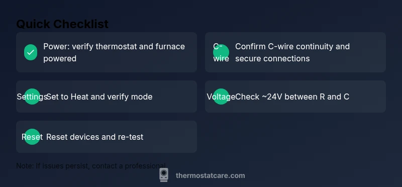 According to Thermostat Care, when a thermostat cannot talk to the furnace, the issue is almost always electrical power, wiring, or configuration. The most common symptom is a non-responsive display or a thermostat that doesn't call for heat even when the room is warm or cold. Start with the simplest checks: confirm the system has power, the thermostat is wired correctly, and the C-wire is intact. Recognizing these patterns quickly can prevent needless part replacement and get you back to comfortable temperatures sooner. Remember: safety first; if you ever feel unsure about exposed wiring, stop and seek professional help.