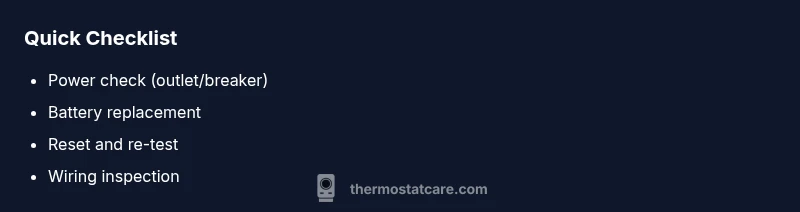 If your thermostat not working, start with the simplest fixes. Step 1: Check power at the thermostat and the breaker or furnace. Step 2: Replace batteries if your model uses them. Step 3: Reset the thermostat and verify that the display is responsive and schedules are saved. If the issue persists, continue with the diagnostic flow for deeper causes.
