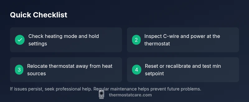 Discover why your thermostat won’t go below 68 degrees and how to troubleshoot safely. Step-by-step checks, a diagnostic flow, and quick fixes from Thermostat Care to restore comfortable heating.