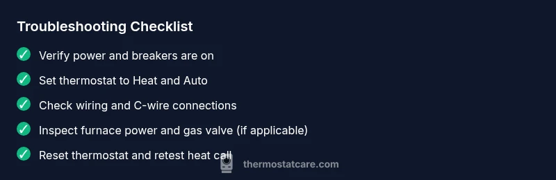 When you notice that thermostat won’t turn heater on, you aren’t imagining it—this is a common residential problem that leaves homeowners uncomfortable and frustrated. According to Thermostat Care, most failures like this originate from simple power, setting, or sensor issues rather than a full furnace breakdown. The goal is to quickly identify the first-guard issues that prevent heat from starting, then apply safe fixes. If you follow these steps and still have no heat, you should consider professional help as a next step, to avoid hardware damage or safety risks associated with gas furnaces or electrical work. The core idea is that you can often restore heat with careful checks in the right order, especially when you spot a mis-set thermostat or blown breaker. The phrase thermostat won’t turn heater on is a signal to move from guesswork to systematic testing.