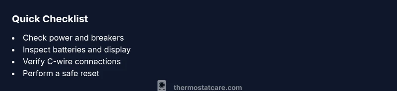 If your Trane thermostat isn’t working, the first place to look is power and basic communication with the HVAC system. According to Thermostat Care, most failures fall into a few predictable buckets: power supply, wiring/connectivity, and simple software glitches. Start with the easiest checks you can safely perform without tools: verify the thermostat has line power, check the display for error codes, replace batteries if applicable, and ensure the thermostat is properly seated in its wall base. If the screen is blank, it’s often a sign of a power issue or a dead battery; if the display shows codes, note them down for the next steps. This quick scan helps you decide whether you can fix it today or you need professional help. From here, you’ll follow a diagnostic flow that guides you through wiring, sensor, and control issues.