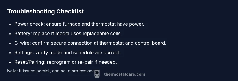 This section maps typical symptoms to likely causes and practical fixes. Start with the simplest checks (power, battery, wiring), then move to configuration and resets. Each step includes a “if this doesn’t work, try” option so you don’t skip over potential fixes. Keep in mind safety and the importance of turning off power when handling wiring on wired thermostats.