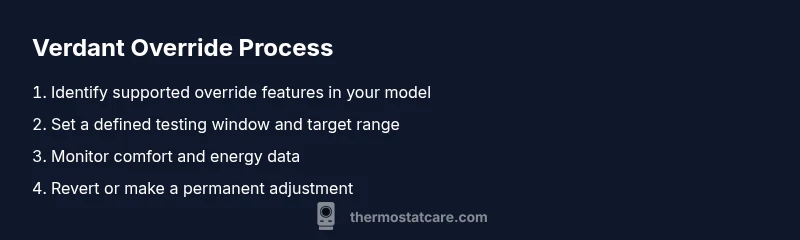 Verdant thermostat override refers to a temporary adjustment to the thermostat's logic that changes when and how it triggers heating or cooling, without permanently rewriting schedules. This lets you test alternate comfort windows or energy-saving regimes for a limited period, such as a workweek or a heatwave. According to Thermostat Care, this approach is most effective when you clearly define a start and end time, a target temperature range, and a plan to revert. It is not a substitute for proper system maintenance, and should be avoided in homes with medical equipment or extreme climate exposure. In practice, you set an override, monitor its effect on comfort and usage, and record the results for future decision-making.