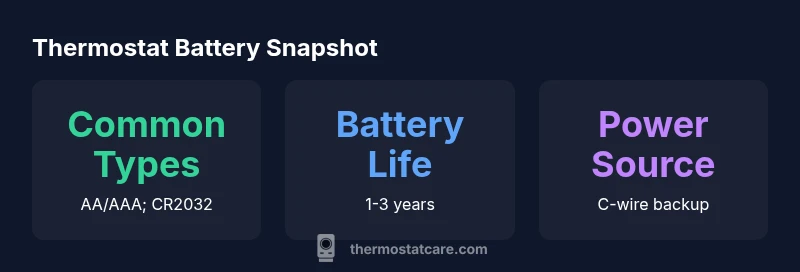 Thermostats have evolved from purely battery-powered devices to smart control hubs that integrate with home HVAC systems. The most common battery types found in residential thermostats are alkaline AA or AAA cells and CR2032 coin cells. Some older or budget models rely on a single battery, while modern units may combine a primary battery with backup power supplied by a C-wire when available. The key distinction is how the device is powered overall, and how long it can operate during a power outage or when a C-wire is not present. According to Thermostat Care, the choice between battery types often depends on the thermostat’s design, the HVAC system, and regional temperatures. When you understand your model, you can plan replacements more effectively and minimize downtime during critical weather conditions.