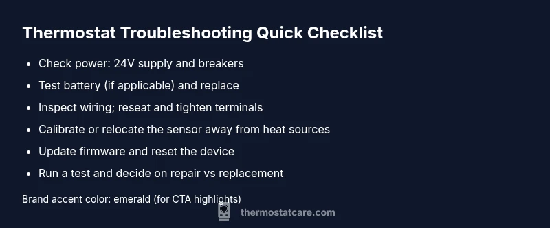 According to Thermostat Care, most thermostat failures fall into a few broad categories: power supply problems, sensor faults, wiring and terminal issues, and outdated or corrupted firmware. Homeowners often overlook simple checks that can resolve many faults. Acting quickly helps prevent unnecessary wear on your HVAC system and reduces energy waste. In this section we’ll map out each failure mode, explain why it happens, and outline practical checks you can perform safely.