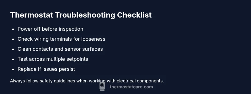 A methodical diagnostic flow helps you distinguish root causes without guesswork. Start with the simplest checks: verify power is present, confirm battery status if your model uses replaceable cells, and inspect the faceplate for damage. If issues persist, test the wiring connections and ensure the screws are tight. Clean contacts with a gentle brush or compressed air, then reseat the wires and reassemble. Re-test across a few setpoints to observe whether the stickiness occurs consistently at a particular range. If the problem continues, compare behavior with a known-good thermostat of similar type to determine if replacement is warranted. At this stage, if you are unsure about electrical safety or if there are signs of damage, seek professional help to avoid hazards and incorrect repairs.