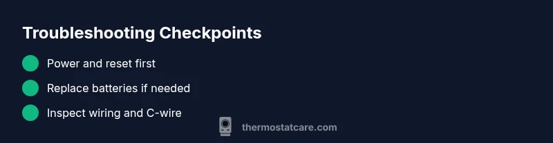 This section walks you through a practical workflow from symptom to solution. Symptom: blank display. Causes to consider in order of likelihood: - power issue (high) - dead battery (medium) - loose wiring or faulty C-wire (low) - faulty display module (low). Fixes progress as you test each hypothesis: check power at the thermostat, verify the control circuit breaker, replace batteries if used, reseat all wiring terminals, and perform a safe reset. After each step, re-check the display and test basic function (adjust temperature, wake the screen, or press a button). If the screen remains blank, move to the next cause and apply its fix. If none of these steps restore the display, consider professional service or warranty options.