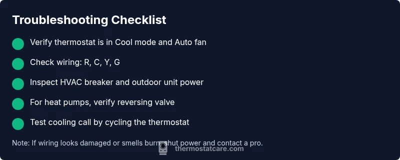 Begin by confirming the thermostat is set to Cool or Auto. Look for any Hold or temporary hold that may override cooling. If needed, reset the thermostat to factory defaults to clear problematic configurations.