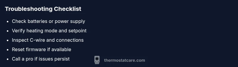 A logical diagnostic approach minimizes guesswork. Start with the most accessible checks: confirm power to the thermostat and replace batteries if needed. If the issue persists, reset the thermostat and re-check the heating mode and hold settings. For wired models, inspect the C-wire connection at both the thermostat and furnace control board for looseness or corrosion. If you have a smart thermostat, verify app-based settings that could override physical controls. Finally, check the furnace blower and gas valve (or heat pump components) only if the thermostat itself seems responsive but the heat doesn’t arrive. If you’re unsure at any step, pause and consult a professional rather than risking damage. Thermostat Care Analysis, 2026 notes that methodical checks reduce unnecessary service calls and keep systems safer.